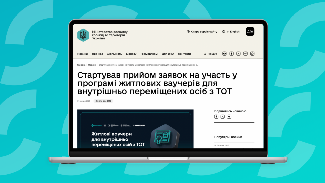 Starting from December 1st, internally displaced persons (IDPs) from the temporarily occupied territories (TOT) who have the status of combatants (CB) or persons with disabilities resulting from the war (PDW), acquired either after the ATO/JFO in 2014 or during the full-scale invasion, can use the new component of the eRecovery program and submit an application for a housing voucher worth 2 million hryvnias.